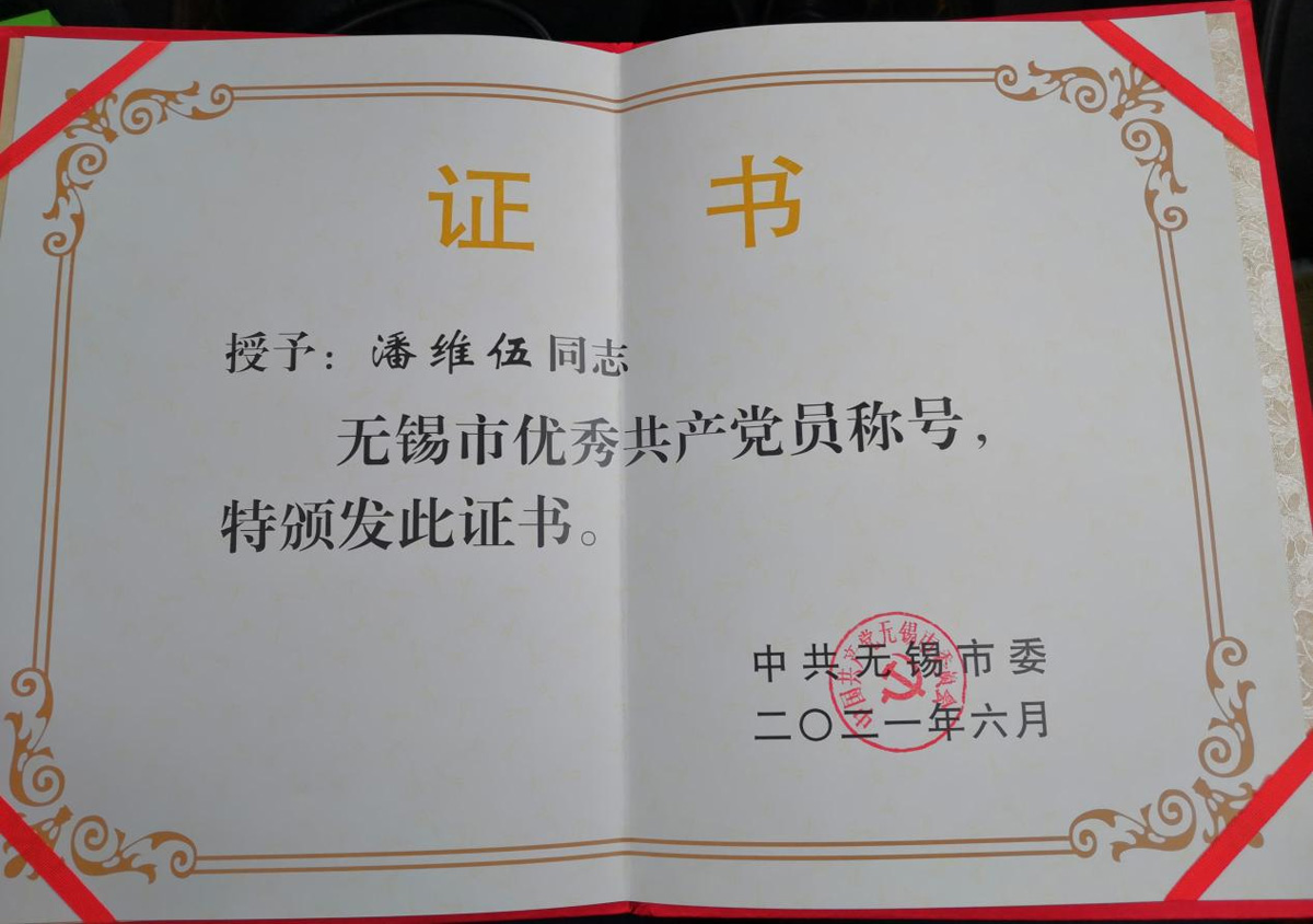 江苏华腾工业设备安装集团有限公司党支部书记、董事长,华腾军创(江苏)科技园有限公司董事长潘维伍被评为无锡市优秀共产党员。