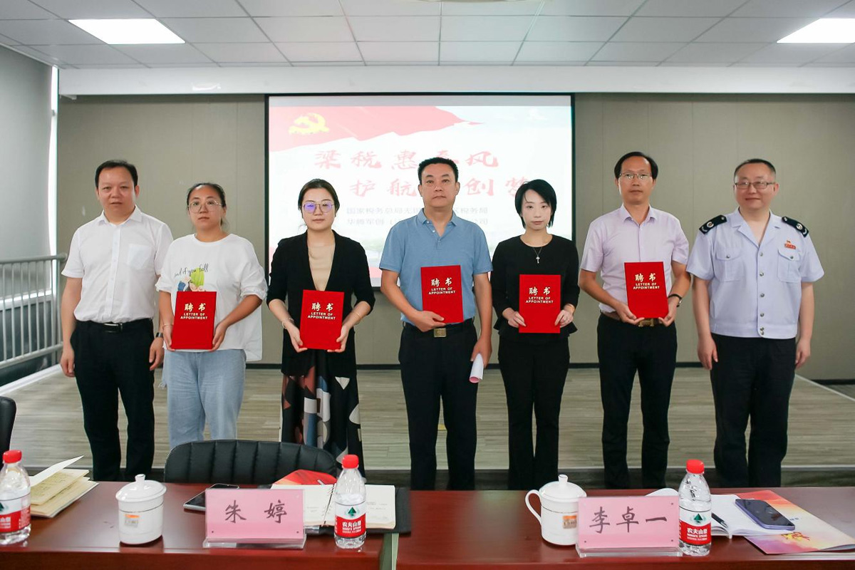 无锡市退役军人事务局张局长、国家税务总局无锡市梁溪区税务局茆局长为五名党员企业家代表颁发“税务体验师”聘书。