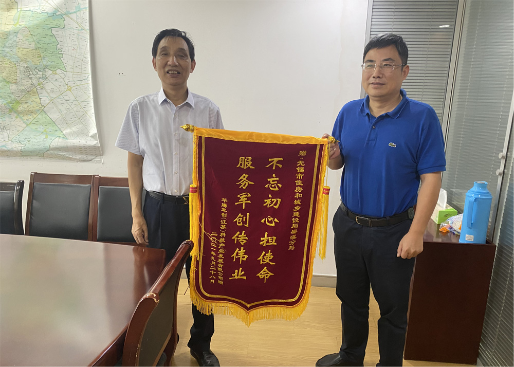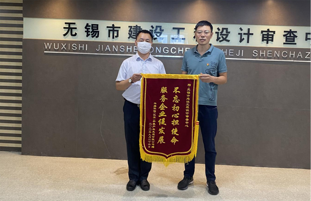 9月30日,华腾军创(江苏)科技园有限公司董事长潘维伍将印有“不忘初心担使命,服务军创传伟业”和“不忘初心担使命,服务企业促发展”的两面锦旗分别送到无锡市住房和城乡建设局梁溪分局和无锡市建设工程设计审查中心,由衷地感谢了无锡市住房和城乡建设局梁溪分局和无锡市建设工程设计审查中心对产业园项目建设的支持和帮助。