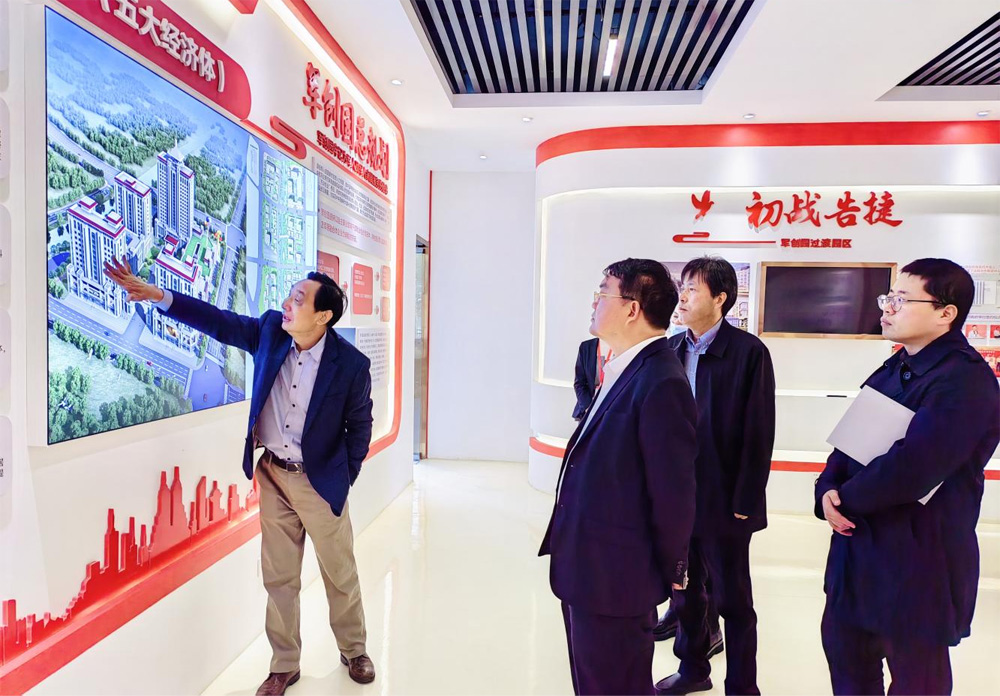 在华腾军创园董事长潘维伍的陪同下,梁书记一行参观了华腾军创园展厅,详细了解华腾军创园基本情况、经营状况和发展规划,并对园区自今年2月份开园以来,已引进入园企业80余家的成绩给予高度肯定。