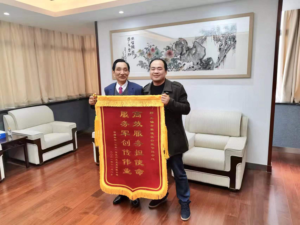 12月10日,华腾军创(江苏)科技园有限公司董事长潘维伍和副总经理任旭东将印有“高效服务担使命,服务军创传伟业”的锦旗送到无锡市梁溪区行政审批中心,以此代表园区和企业感谢区行政审批中心在为其办理营业执照和实体落户业务过程中,提供的热情、优质、高效的审批服务。副局长朱建忠代表区行政审批中心接受了锦旗。