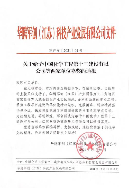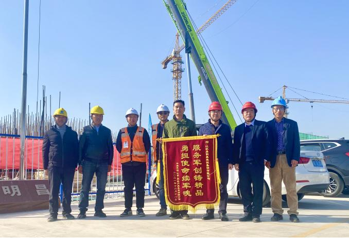 近日,华腾军创园副总经理任旭东和工程部经理莫雨凡到华腾军创(江苏)产业园工地,将印有“服务军创铸精品,勇担使命续军魂”的锦旗和嘉奖令送到两家总包单位。