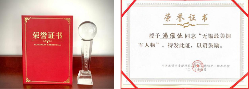 7月29日,无锡市举办“‘军’心永向党 奋进新征程”无锡最美退役军人、最美拥军人物、最美军属、最美军休干部发布活动,隆重表彰了48位“最美”人物。市委书记杜小刚作批示,市委常委、无锡军分区司令员王作才,副市长卢敏,省退役军人事务厅二级巡视员陈日明,市委副秘书长、市双拥办主任马剑,市委宣传部副部长高燕,市纪委监委派驻第一纪检监察组组长成丹歌,无锡军分区政治工作处主任江涛等出席活动。活动现场,华腾军创园董事长潘维伍获评“无锡最美拥军人物”,在激昂的音乐中,身披绶带,登台领奖。