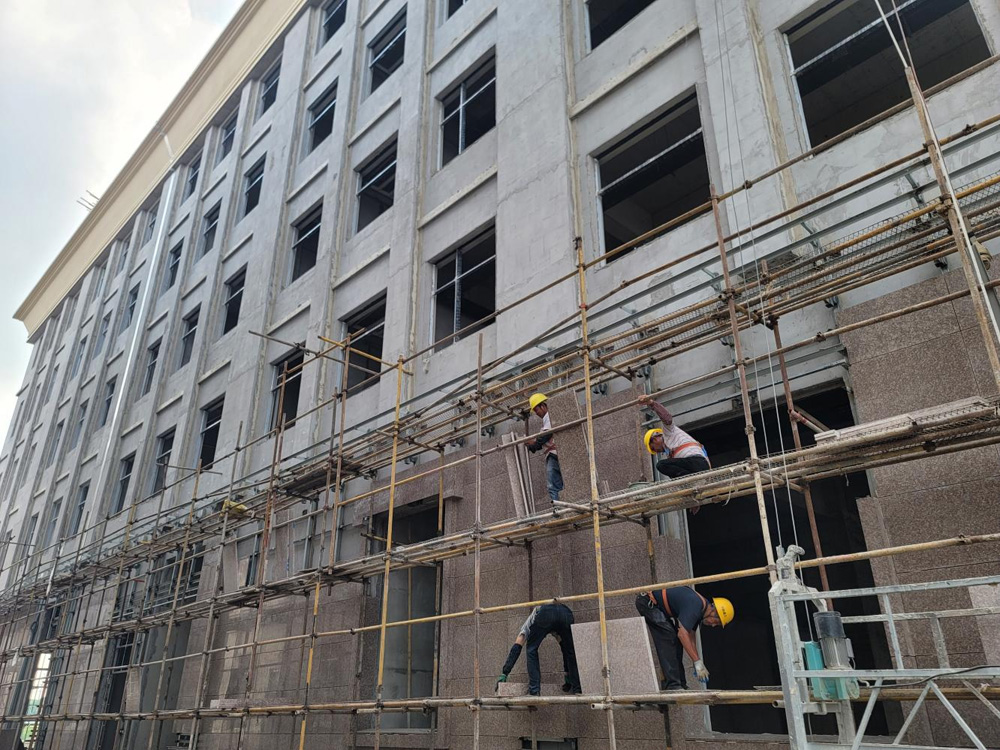 走进项目施工现场,滚滚热浪扑面而来,经过长时间高温炙烤,建筑表面温度超过50度,仿佛置身一个“大火炉”。施工区域数十名工人正抢抓一天中温度较低的空档,有条不紊的忙碌着,不怕酷暑、不畏辛劳,豆大的汗水从脸颊滑落,湿透的衣服紧贴身上,但丝毫不影响坚定的脚步。针对持续高温天气,现场管理人员在做好防暑降温措施的同时,采取轮班作业、错峰作业、科学布置,全力保障一线工人的生命安全和身体健康。