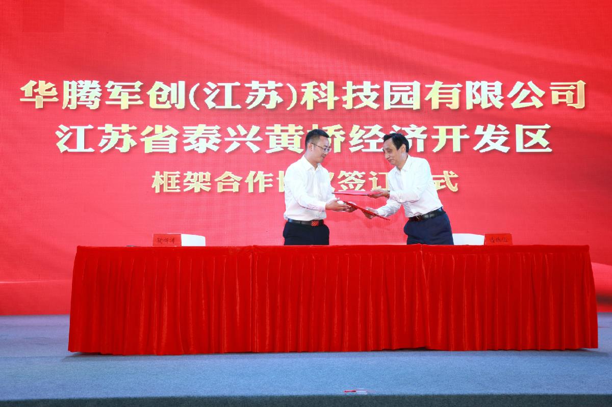 启动仪式上,本着为广大退役军人及军人家属就业创业提供良好服务,整合双方资源,实现互惠互利、融合发展的合作宗旨。华腾军创园董事长潘维伍与江苏泰兴黄桥经济开发区管理委员会副主任鞠新涛代表双方签署战略合作框架协议。