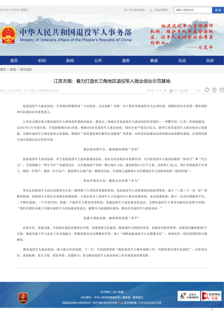11月8日,中华人民共和国退役军人事务部地方动态专栏,以《江苏无锡:着力打造长三角地区退役军人就业创业示范基地》为题,报道华腾军创园经验做法,充分肯定了园区创建成效。