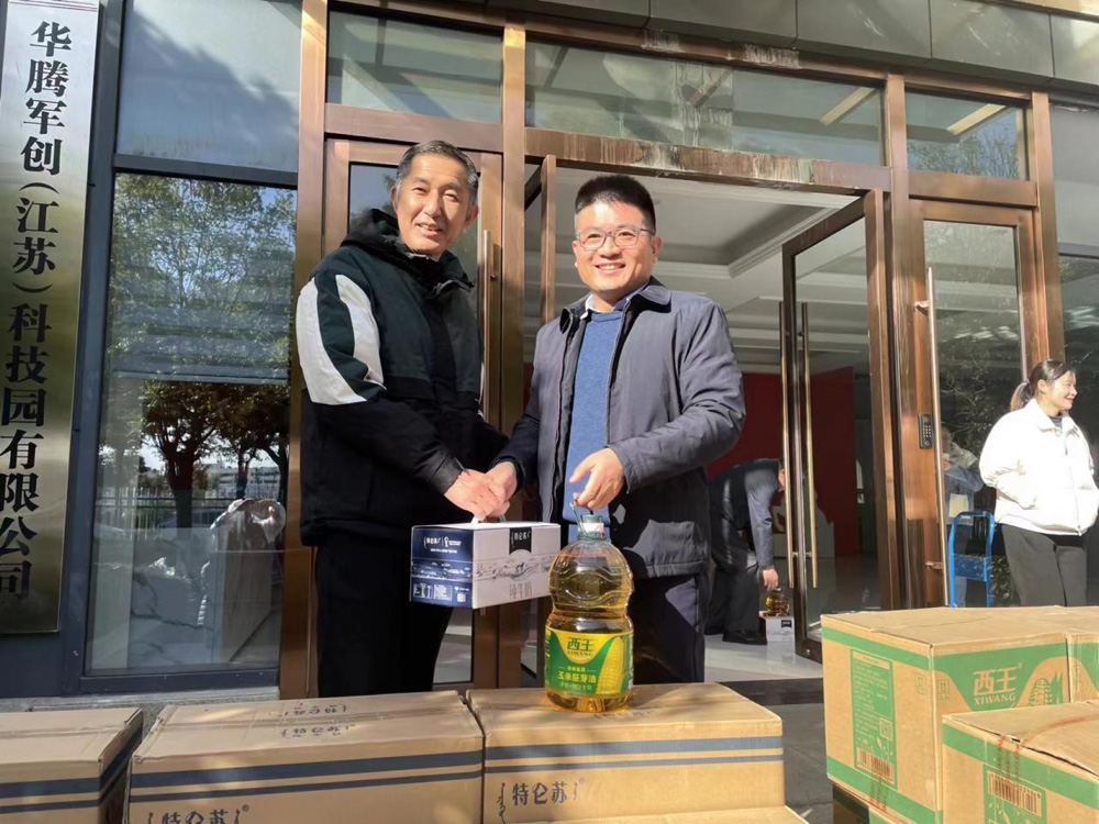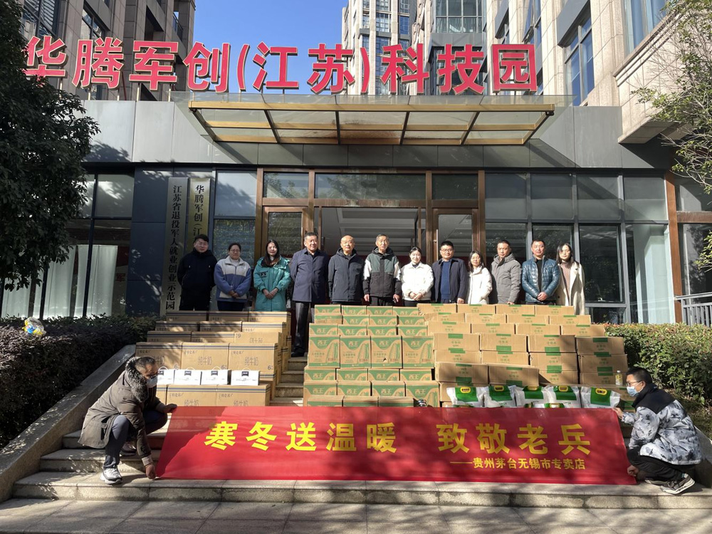 12月14日,华腾军创园股东、无锡市荣氏贸易有限公司董事长荣礼、茅台传承人周科程带领的慰问团莅临华腾军创园,慰问我司退役军人,并送上了牛奶、大米、玉米油等冬日温暖。
