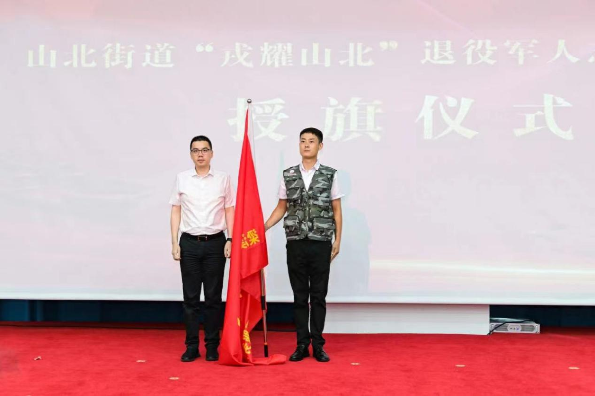 辛乐为山北街道“戎耀山北”退役军人志愿服务队授旗