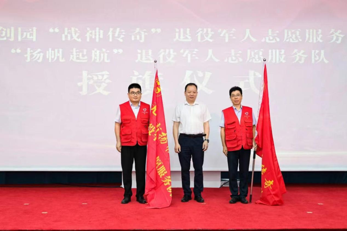 张赟为军创园“战神传奇”退役军人志愿服务队、“扬帆起航”退役军人志愿服务队授旗