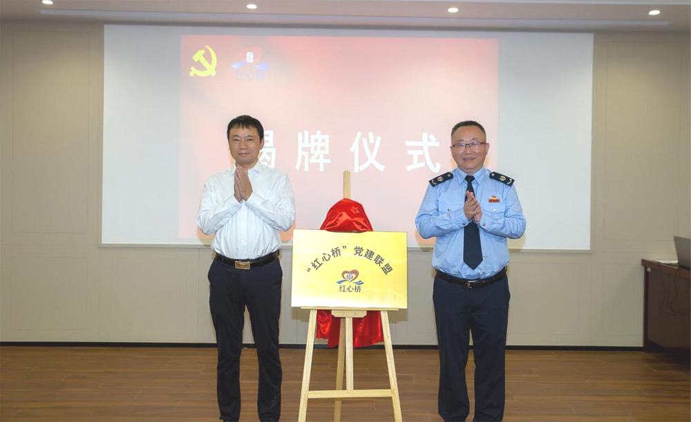无锡市退役军人事务局党组成员、副局长常亚敏和梁溪区税务局党委书记、局长茆俊共同为“红心桥”党建联盟揭牌。