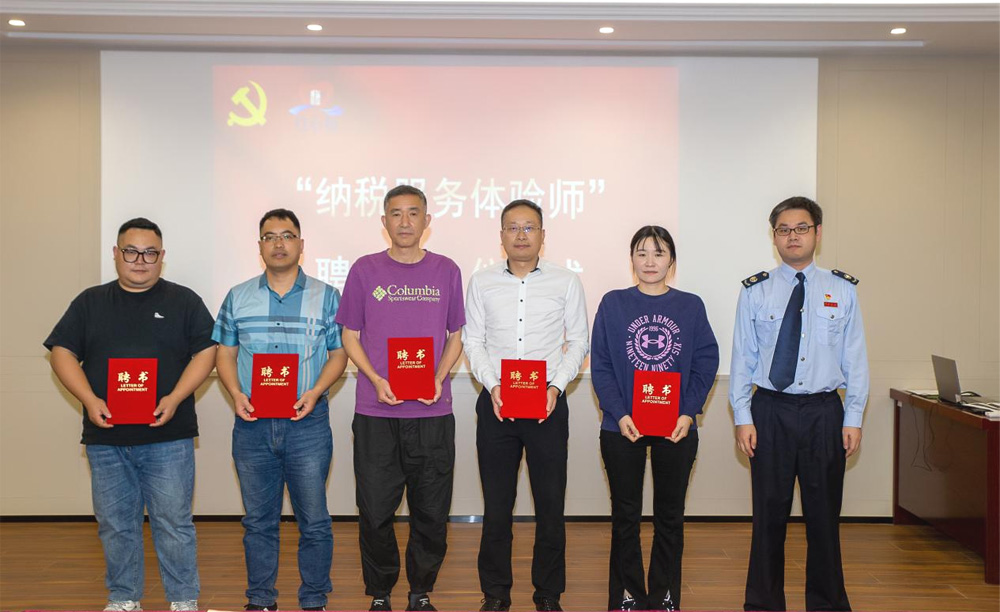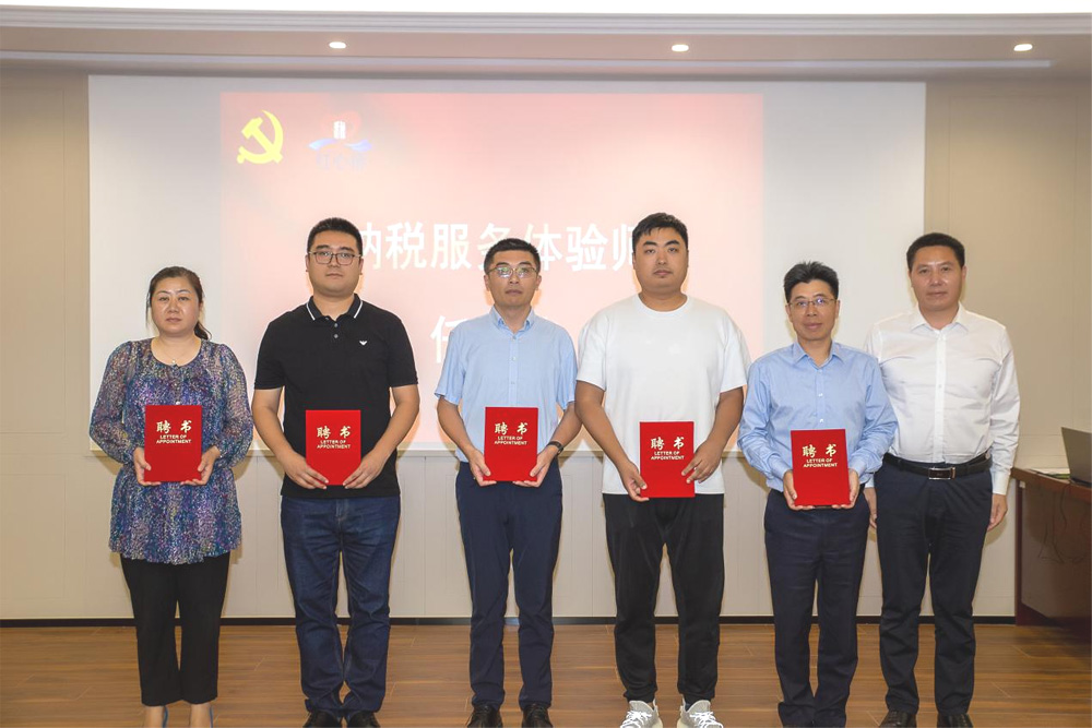 梁溪区税务局党委委员、纪检组长周森与山北街道党工委委员、人武部部长程远为10名企业家代表颁发“纳税服务体验师”聘书。