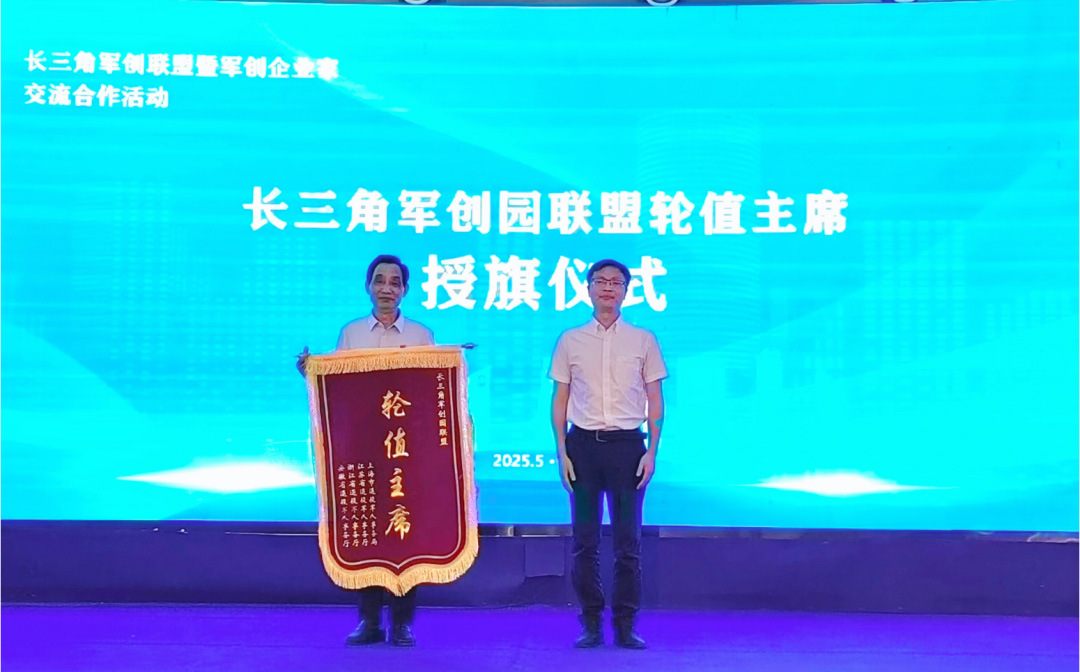 随后,举行了长三角军创园联盟轮值主席授旗仪式。潘维伍董事长从上一任轮值主席单位——浙江省退役军人创业创新园代表手中接过联盟旗帜,成为新一任长三角军创园联盟轮值主席。