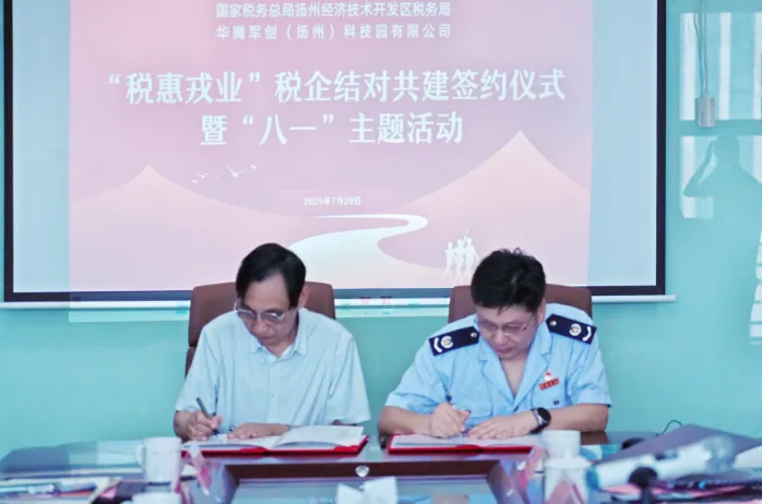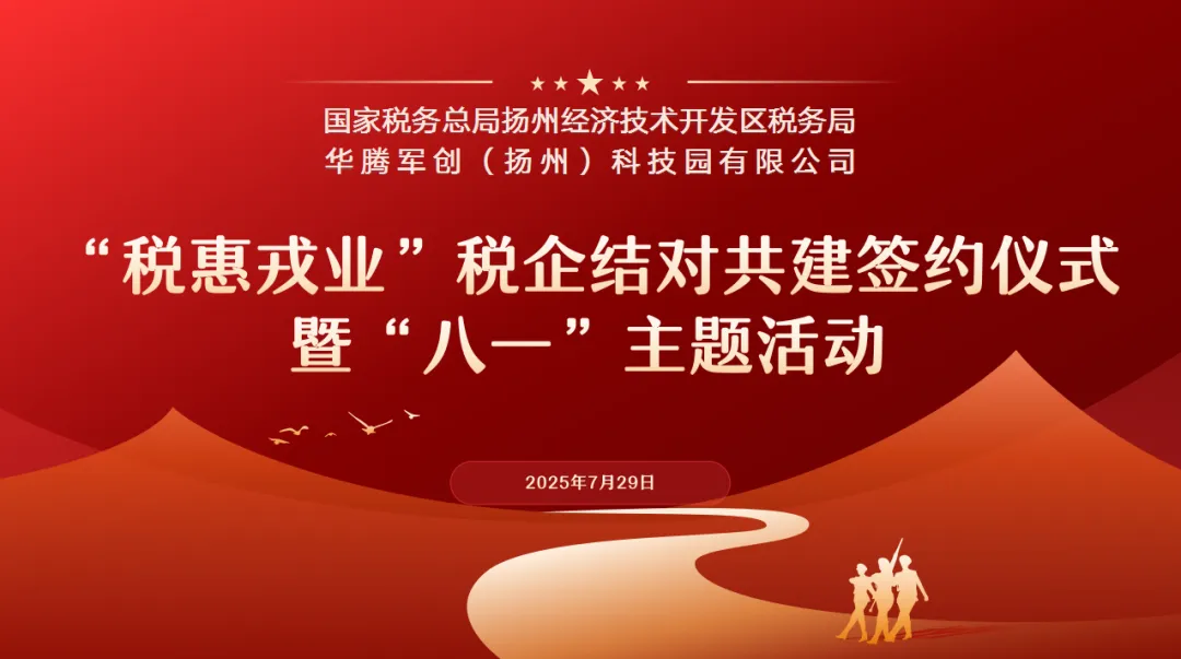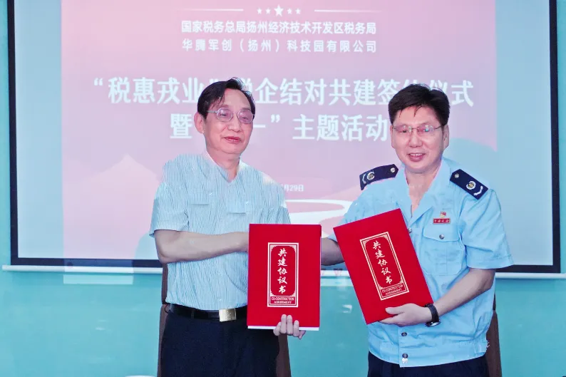 7月29日,在八一建军节来临之际,华腾军创(扬州)科技园内热潮涌动。国家税务总局扬州经济技术开发区税务局与华腾军创园联合举办“税惠戎业”税企结对共建签约仪式暨退役军人“八一”主题活动 。扬州市税务局党委委员、总经济师吴兵,扬州市退役军人事务局党组成员、副局长吴敬文,经开区税务局党委书记、局长秦国宝,华腾军创园(扬州)科技园董事长潘维伍、常务副总经理毕宁及经开区税务局退役军人代表、经开区退役军人企业代表共计30余人参加活动。活动由经开区税务局党委书记、局长秦国宝全程主持,税企双方以“税务蓝”赋能“军创绿”,共同为退役军人创业注入强劲动能。