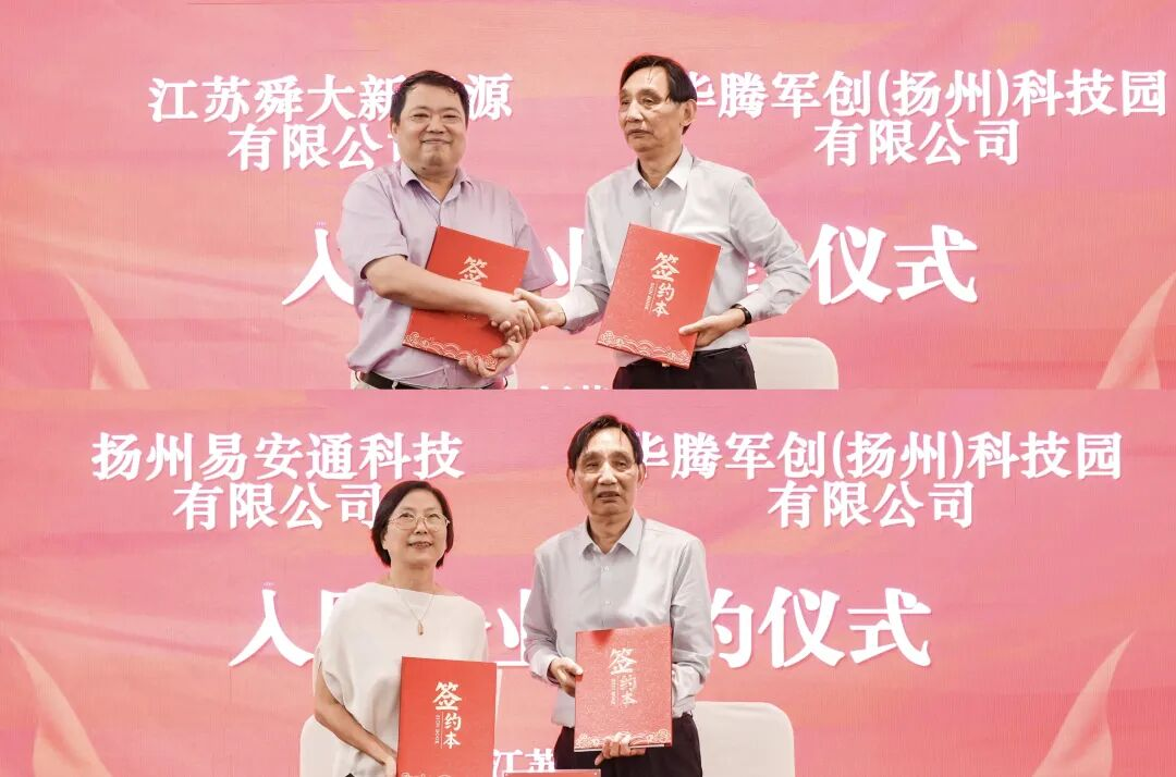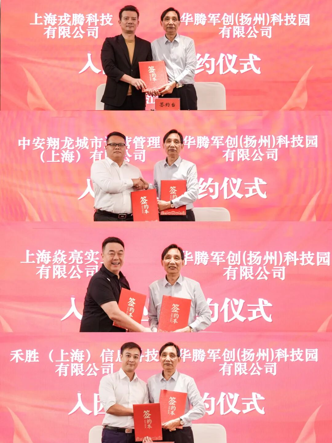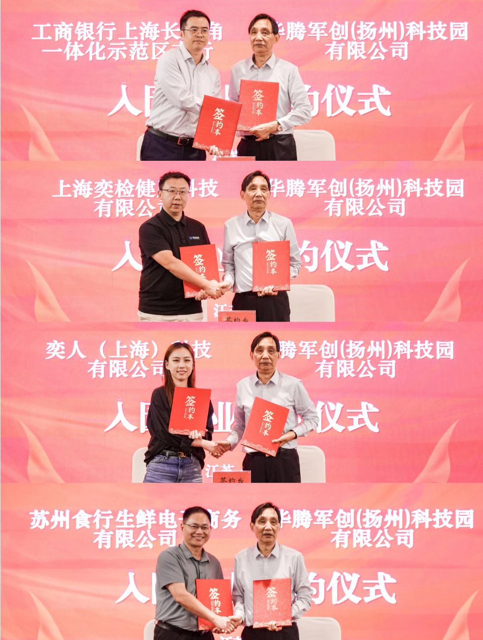 随后,现场举行了隆重的新一批企业入驻签约仪式。在全体嘉宾的共同见证下,华腾军创园与上海戎腾科技有限公司、中安翔龙城市运营管理(上海)有限公司、上海焱亮实业有限公司、禾胜(上海)信息科技有限公司、工商银行上海长三角一体化示范区支行、上海奕检健康科技有限公司、奕人(上海)科技有限公司、苏州食行生鲜电子商务有限公司、江苏舜大新能源有限公司、扬州易安通科技有限公司依次签署入驻协议。这十家新入驻企业,精准涵盖科技研发、城市运营、金融服务、健康医疗、新能源与现代服务等多个前沿领域,它们的集体加入,将为沪扬军创联盟注入强劲动能,开启协同发展新篇章。